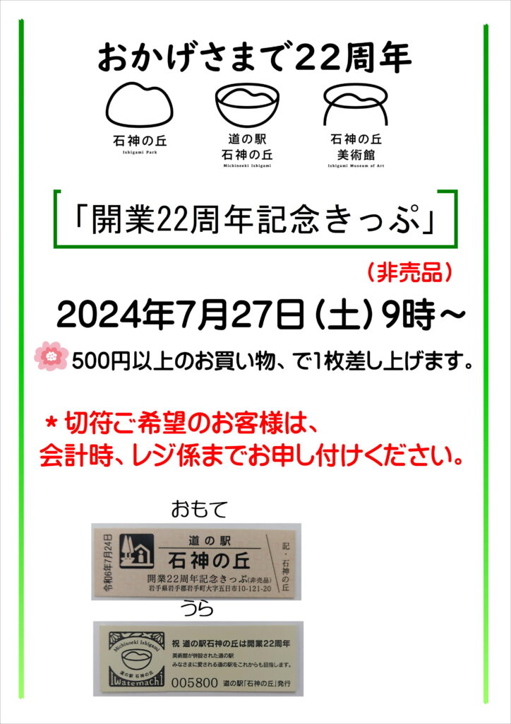 ☆石神の丘開業22周年特別記念切符☆ お知らせ 2024.07.18 おかげさまで、道の駅「石神の丘」は開業22周年を向かえます! 7月27日(土)9:00より【開業22周年特別記念切符】(非売品)を、500円のお買いもので1枚、又は通常切符3枚の購入で1枚差し上げます。 限定300枚(非売品)となりますので、なくなり次第終了とさせていただきます。 ぜひ、記念に特別記念切符を手に入れてみてくださいね!
