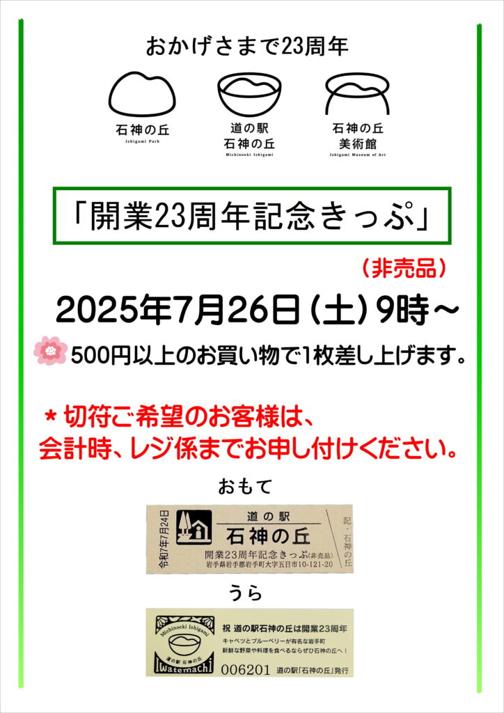 ☆石神の丘開業23周年特別記念切符☆ お知らせ 2025.07.22 おかげさまで、道の駅「石神の丘」は開業23周年を向かえます! 7月26日(土)9:00より【開業23周年特別記念切符】(非売品)を、500円のお買いもので1枚、又は通常切符3枚の購入で1枚差し上げます。 限定300枚(非売品)となりますので、なくなり次第終了とさせていただきます。 ぜひ、記念に特別記念切符を手に入れてみてくださいね!