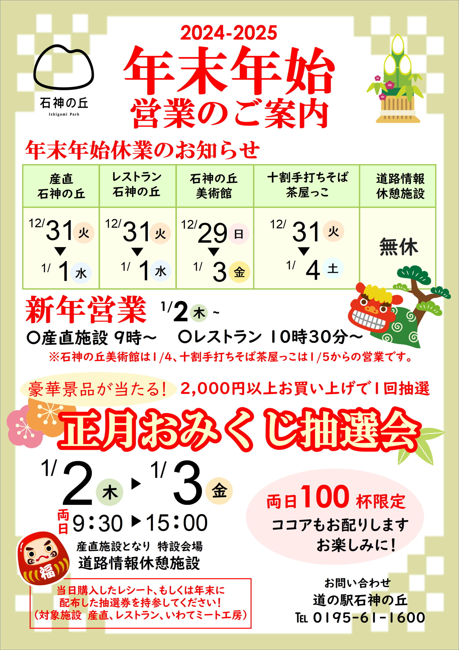 年末年始のご案内 お知らせ 2024.12.16 本年も、道の駅石神の丘をご利用いただき誠にありがとうございました。 2025年1月2日・3日は日頃の感謝を込めて『正月おみくじ抽選会』を開催いたします。 2,000円以上お買い上げ毎に1回抽選できます! 12月21日から12月30日までは、産直で2,000円以上お買い上げ毎に2日・3日に抽選できる抽選券を1枚差し上げます。 豪華景品をご用意しておりますので、ぜひお越しくださいませ♪