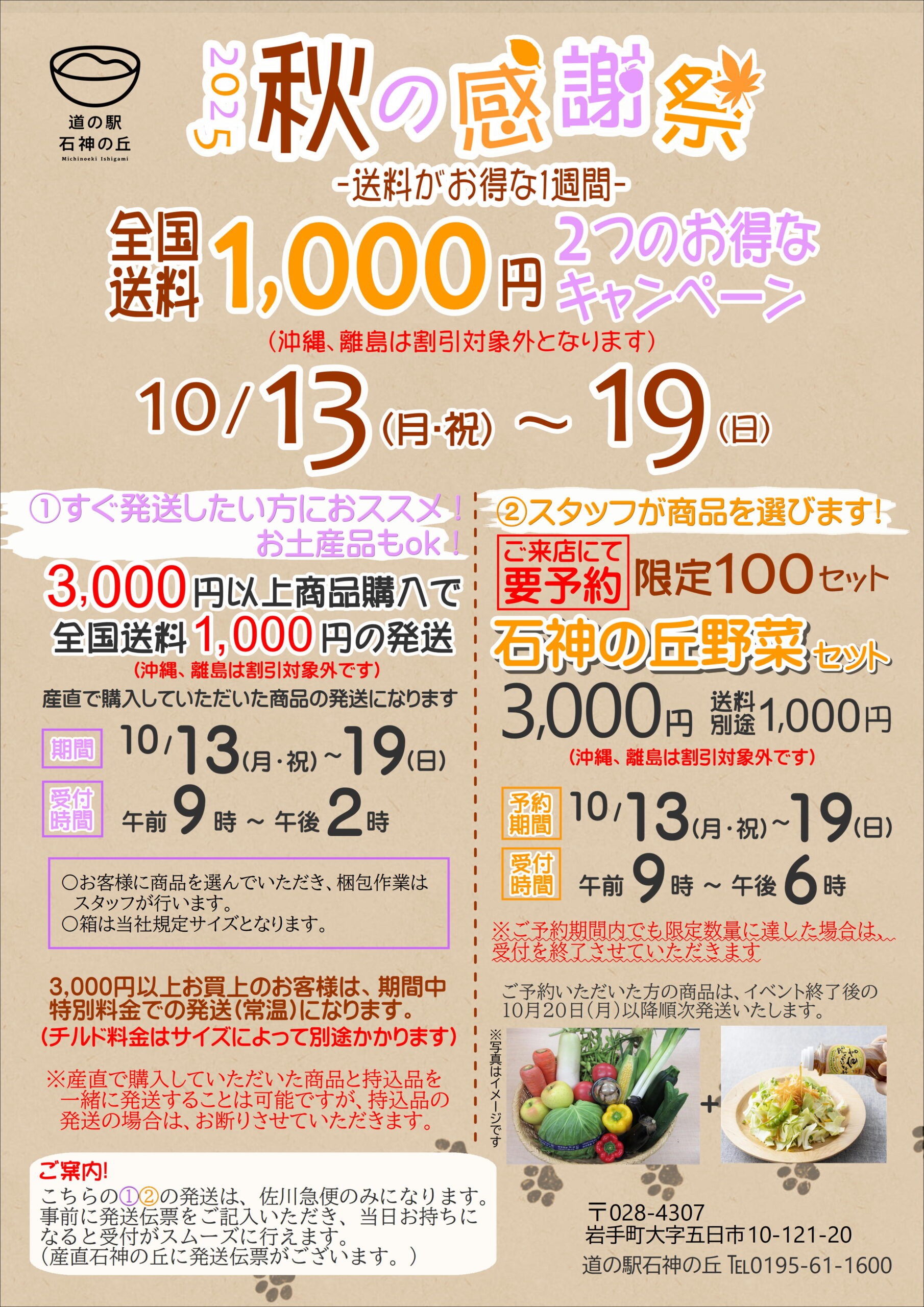 道の駅「石神の丘」より、お客様へ日頃の感謝の気持ちを込めて「全国一律送料1箱1,000円」企画!!(沖縄・離島は割引対象外となります)